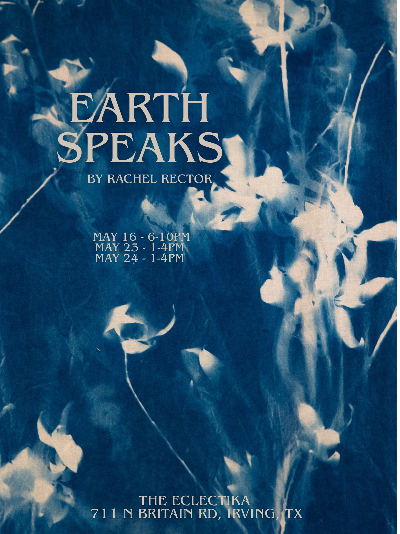 Coming up in May, ‘Earth Speaks’ a solo exhibition by Rachel Rector presented in collaboration with AFPA Gallery (Orlando, FL). The opening reception will be held Saturday, May 16 from 6-10pm. The Eclectika is located at 711 N. Britain Rd. Irving, Texas, 75061.