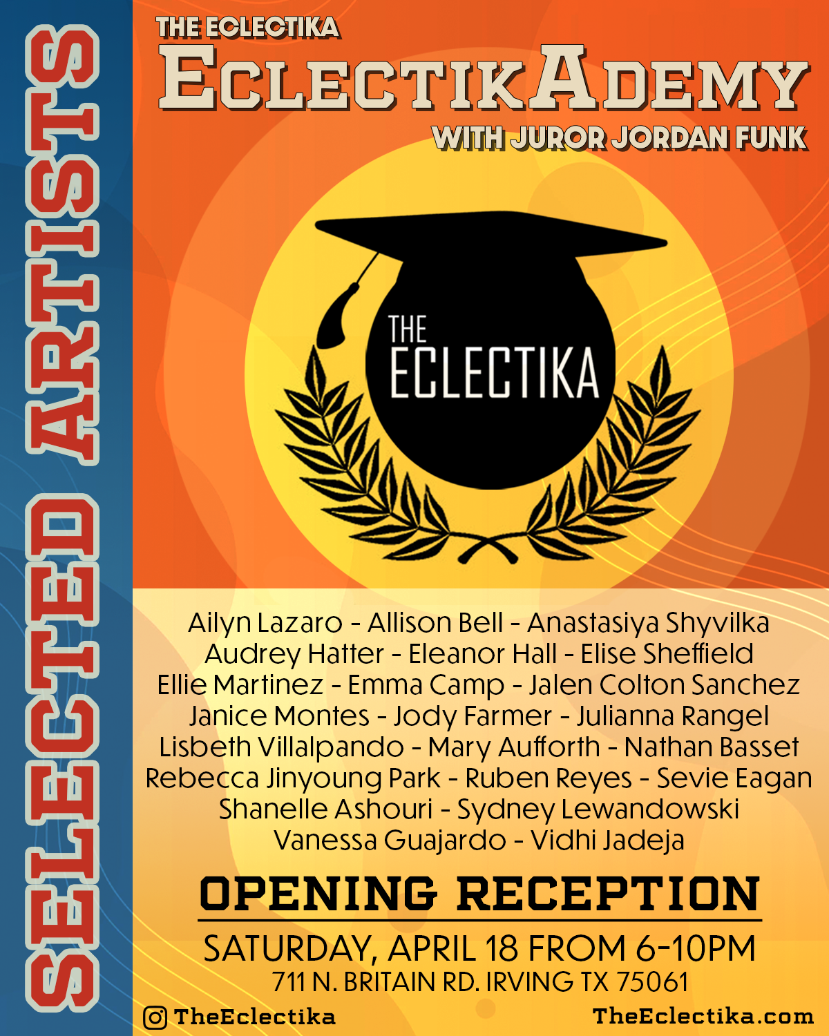 Coming up in April, The Eclectika’s first annual juried college exhibition ‘EclectikAdemy’ with juror Jordan Funk! This exhibition features a diverse offering of works by 22 college students from the North Texas region. The opening reception will be held Saturday, April 18 from 6-10pm followed by an open viewing on Sunday, April 19 from 1- 4pm. The Eclectika is located at 711 N. Britain Rd. Irving, Texas 75061.