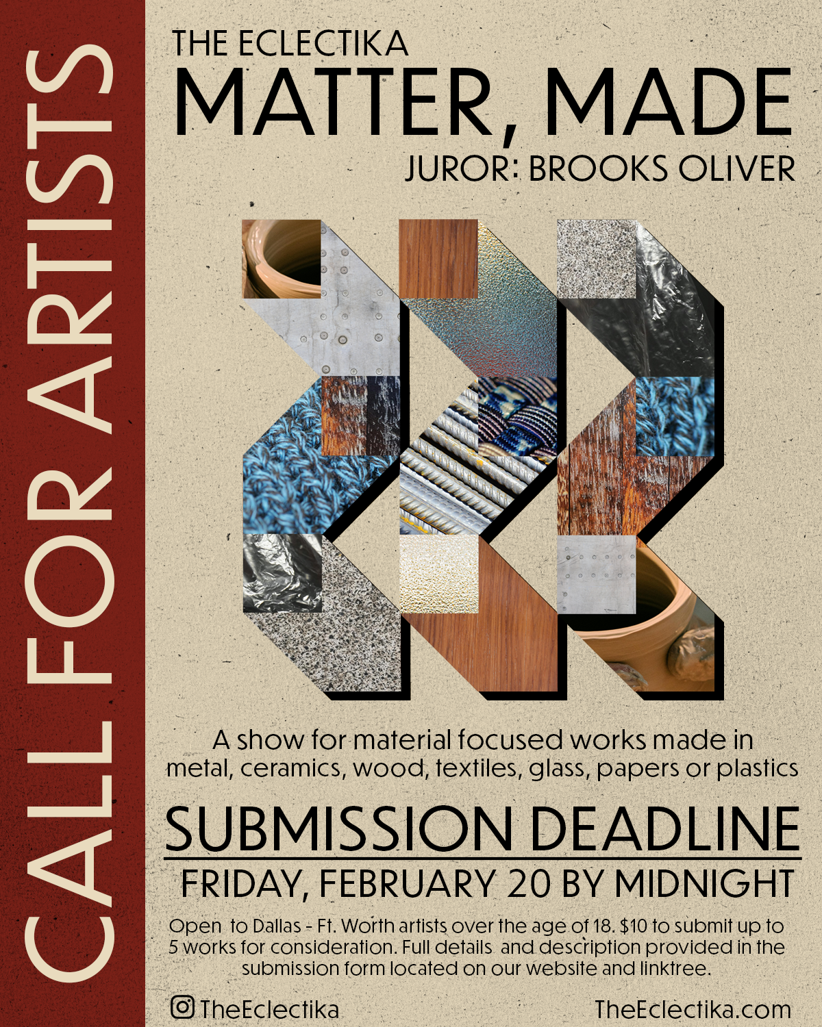 The Eclectika is excited to announce our upcoming materials focused show ' Matter, Made'! The juror for this exhibition is artist and educator Brooks Oliver. 'Mater, Made' is open to all artists over the age of 18 that reside in the DFW metroplex. Artists are welcome to submit up to 5 works for the juror's consideration. Submission fee for the show is $10, payable through our website. Deadline to submit is Friday, February 20 at midnight. Full details below.